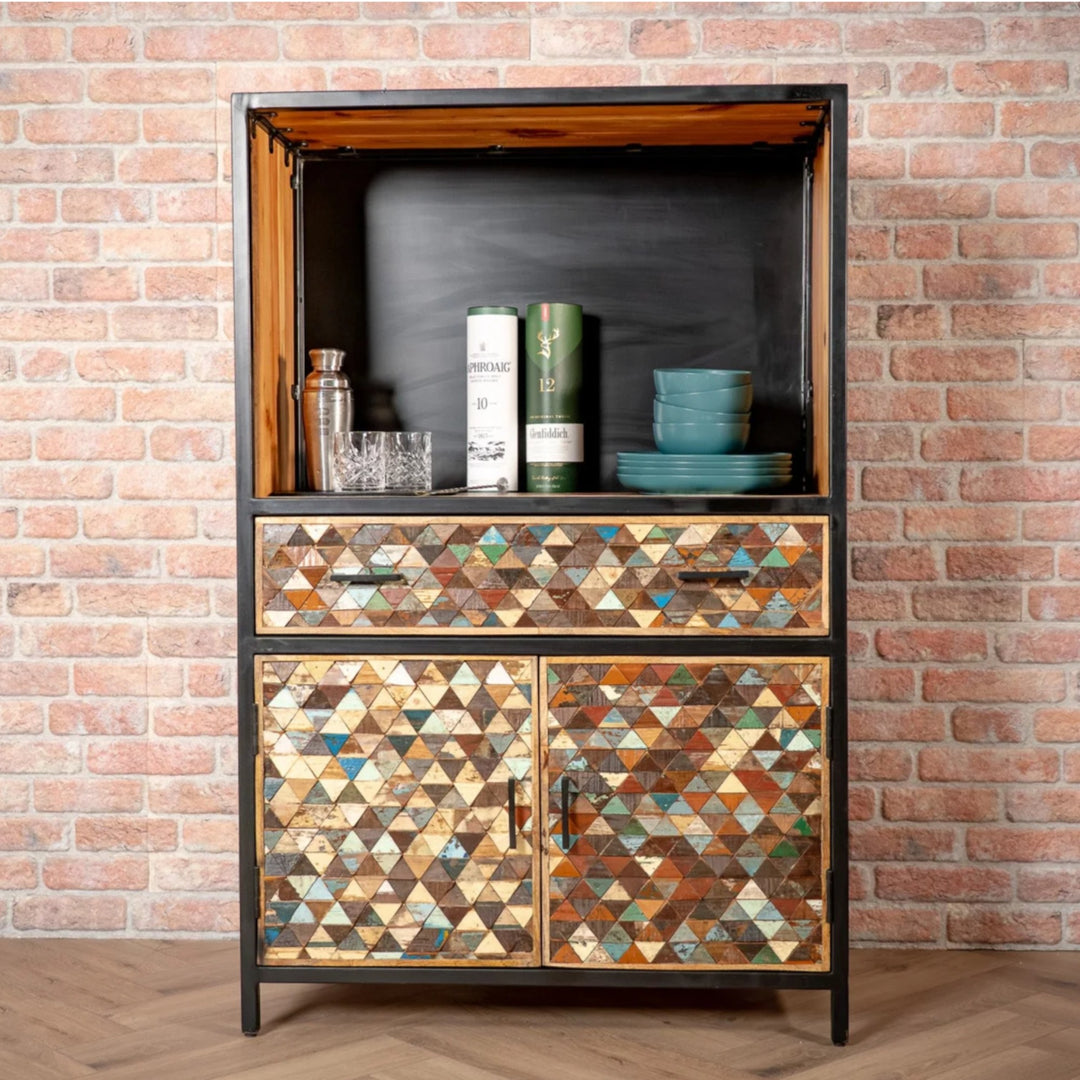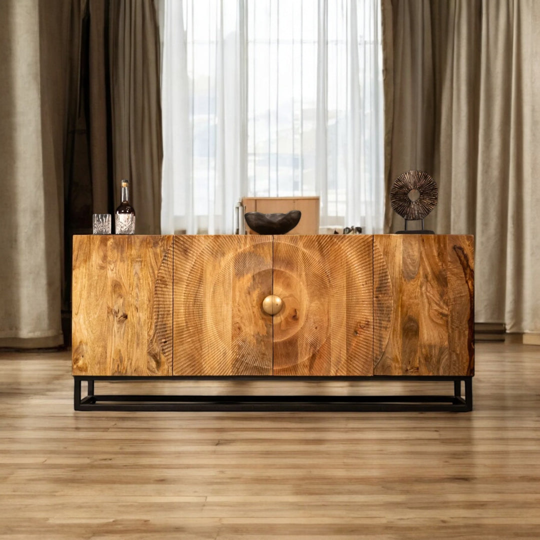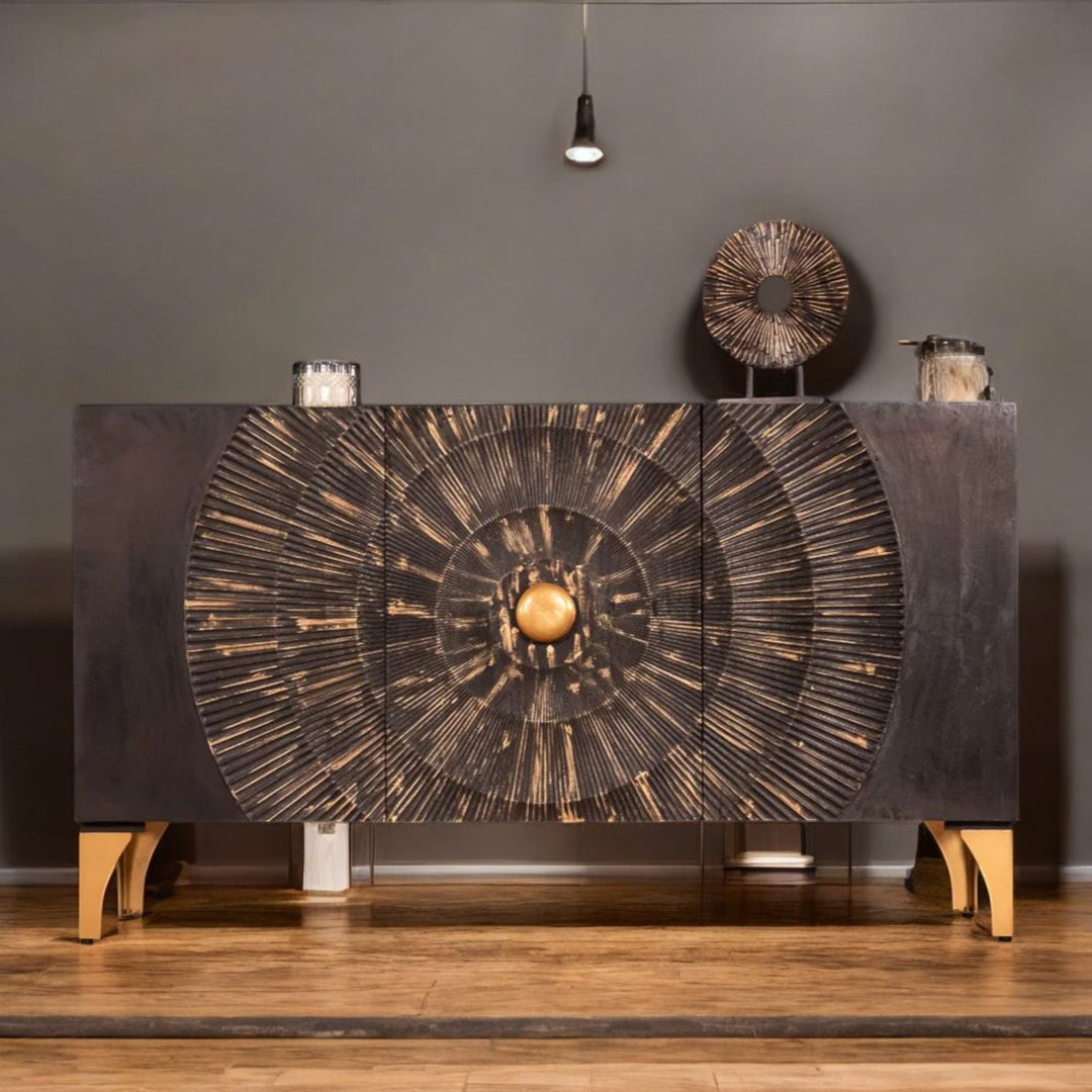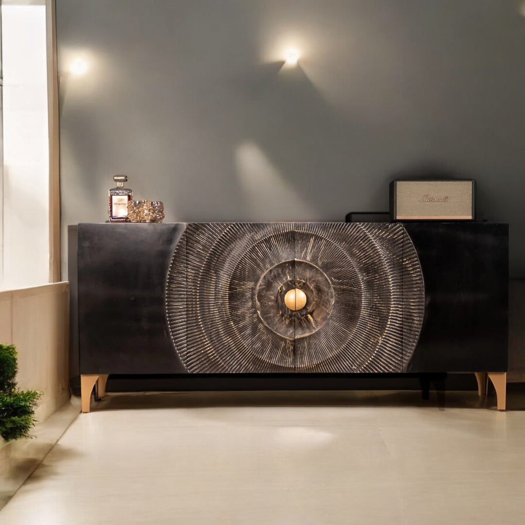 Crafted from solid wood and a little bit of metal for decorative purposes, this type of cabinet showcases the unique grain patterns and knots that make this piece one-of-a-kind. This sideboard effortlessly blends rustic aesthetics with modern functionality. They appear to be extremely royal, exhibiting oodles of opulence and luxury.