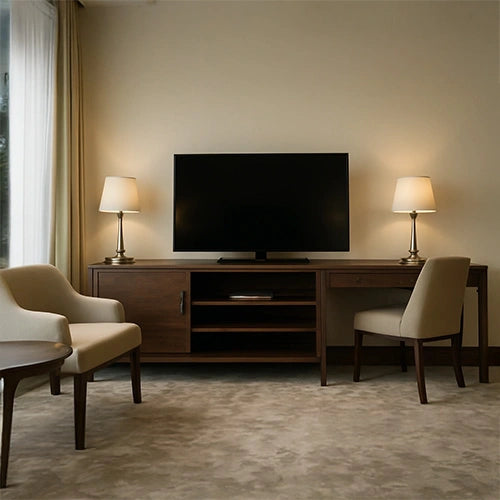 How do you want your guests to feel once they enter a hotel room? Incredible! isn’t it? To influence guest experiences and create a positive first impression, buy hotel furniture from Nismaaya Decor- a brand synonymous with aesthetics, functionality, and comfort. We know the significance of creating the right ambience, which is often established by installing the right hotel room furniture, exuding luxury and richness. From plush armchairs to rich wood finishes on double beds, every element works towards making your guests feel valued and important. To make their stay comfortable and delightful, pay attention to buying the most refined furniture units from us.