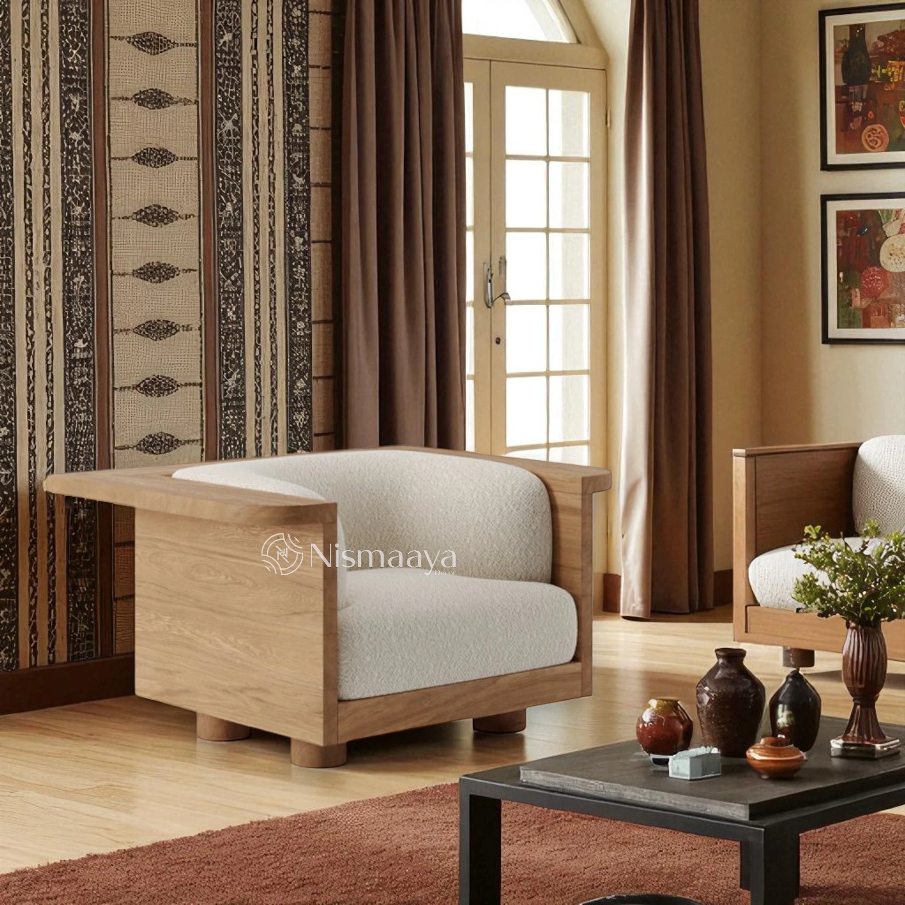 At Nismaaya Decor, we keep updating our designs, and there may be some changes and variations in materials and elements used in comparison to what you see online. However, these changes will be minor, not affecting your preferences and design choices. As wood and stone are natural products, they react in a different way to staining, and thus they may impact their appearance in terms of colour, grains, and patterns. The handmade fabrics look slightly different in the photographs due to angles and lighting. Also, we confirm the availability of fabrics used in the furniture pieces post receipt of the payment.