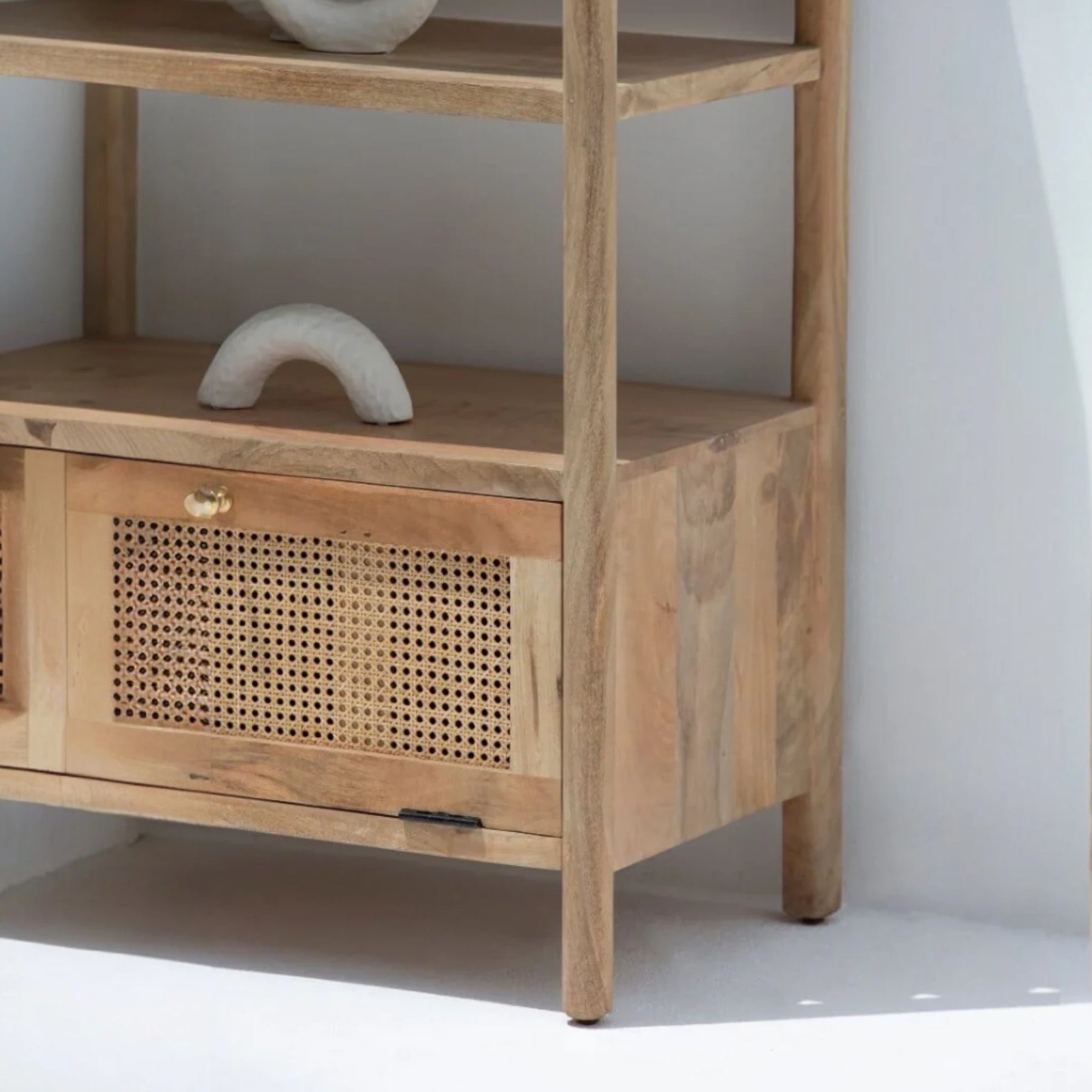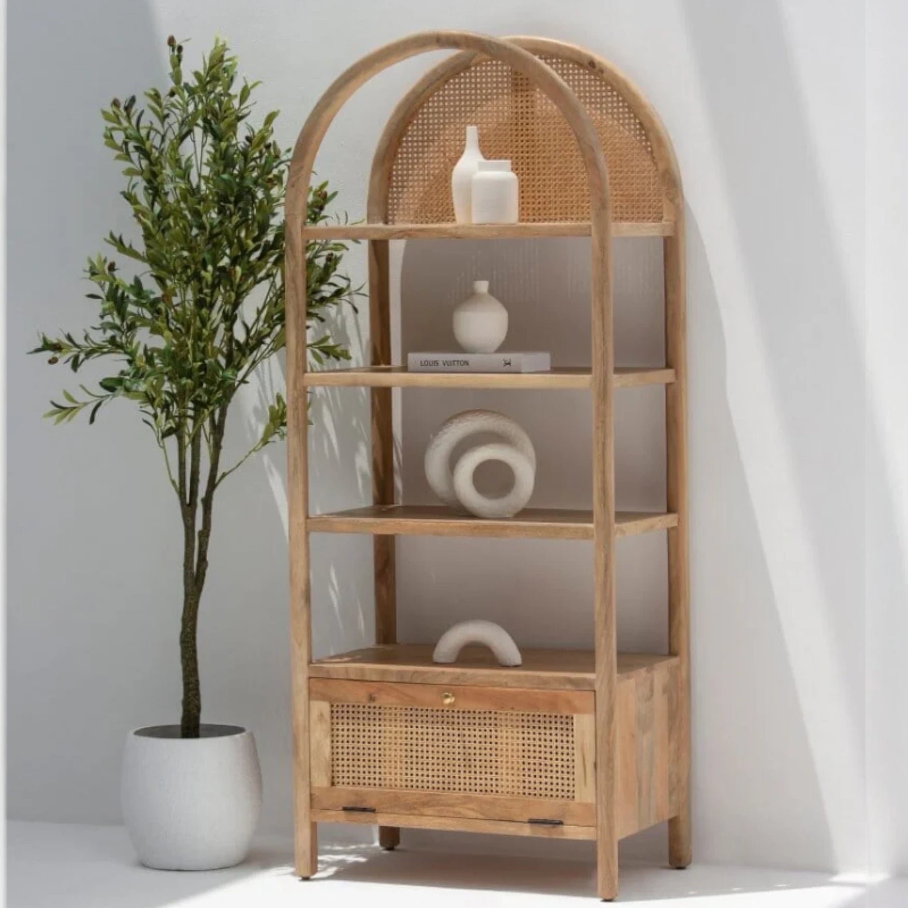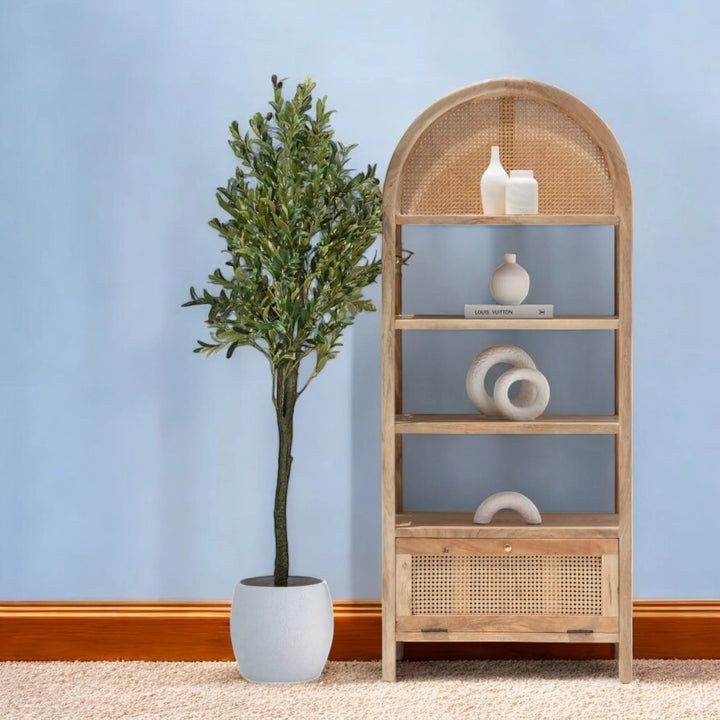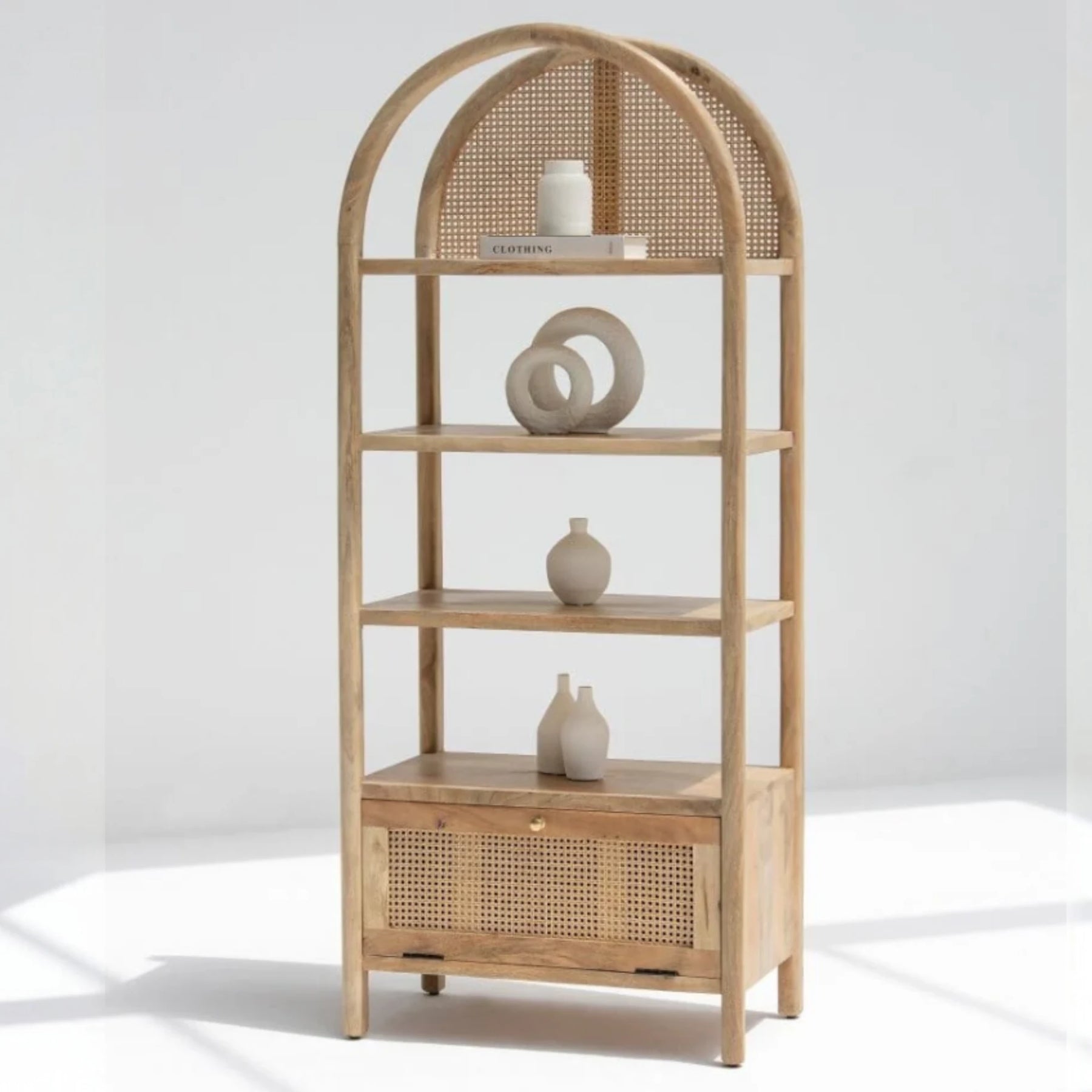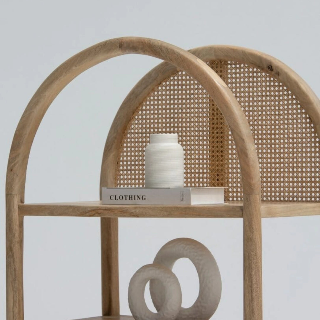 | Description | Crafted from rich mango wood, the Edith Wooden Display Shelf exudes a natural charm with its arched design and clean lines. This elegant shelf features four spacious shelves perfect for displaying decorative items, books, and collectibles. A rattan drawer at the bottom provides additional storage, combining functionality with style. |