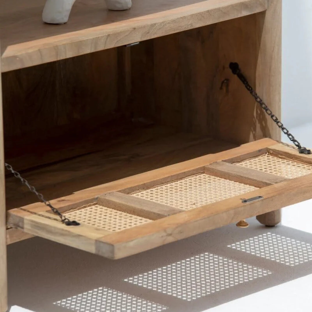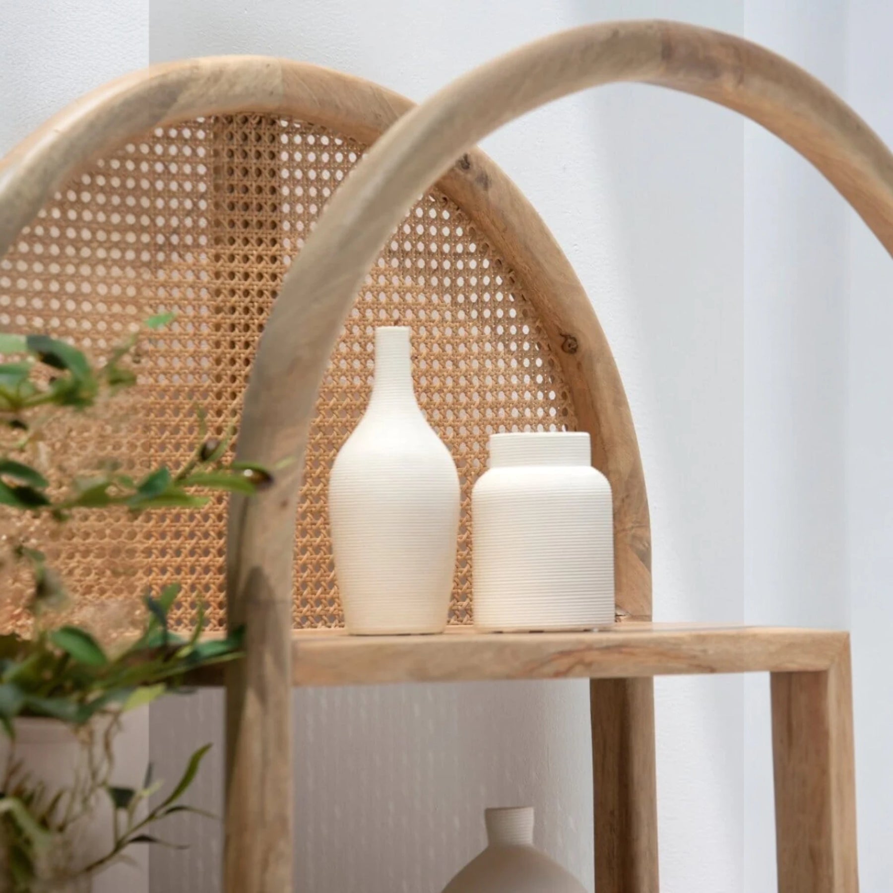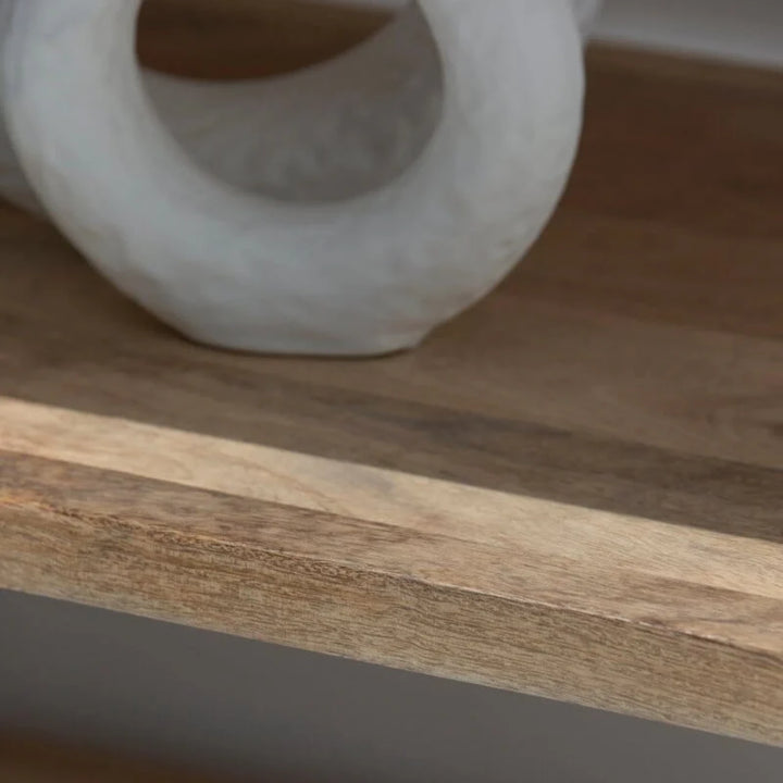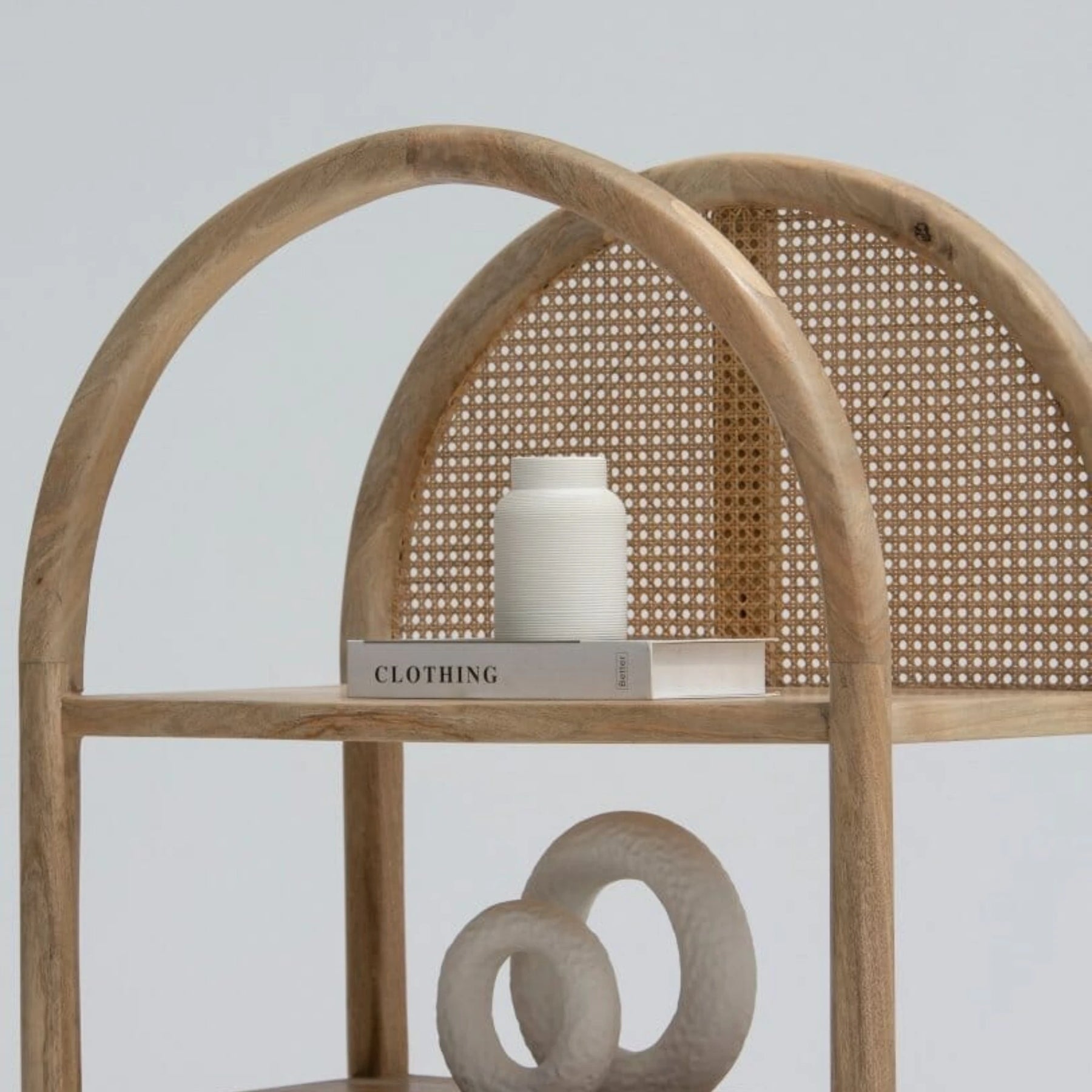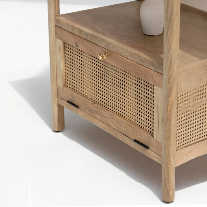 | Description | Crafted from rich mango wood, the Edith Wooden Display Shelf exudes a natural charm with its arched design and clean lines. This elegant shelf features four spacious shelves perfect for displaying decorative items, books, and collectibles. A rattan drawer at the bottom provides additional storage, combining functionality with style. |