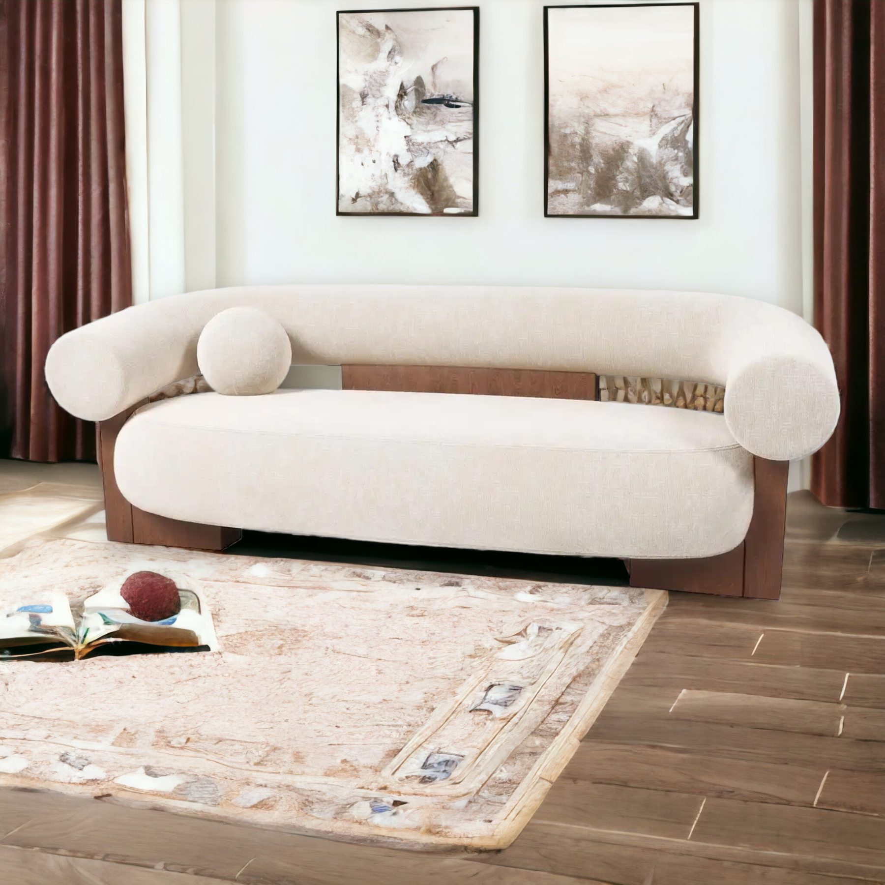 Introducing the Fabrice 3 Seater Walnut Wood & Boucle Sofa: Where Walnut Wood and Boucle Texture Elevate Comfort and Elegance! Speciality |