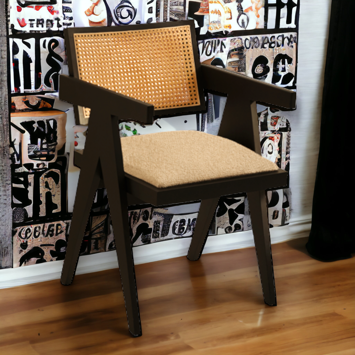 The NISMAAYA Hilarius Rattan Dining Chair with Upholstered Seat in Black effortlessly blends contemporary design with the timeless allure of rattan. Its black finish and upholstered seat add a touch of sophistication to your dining space.