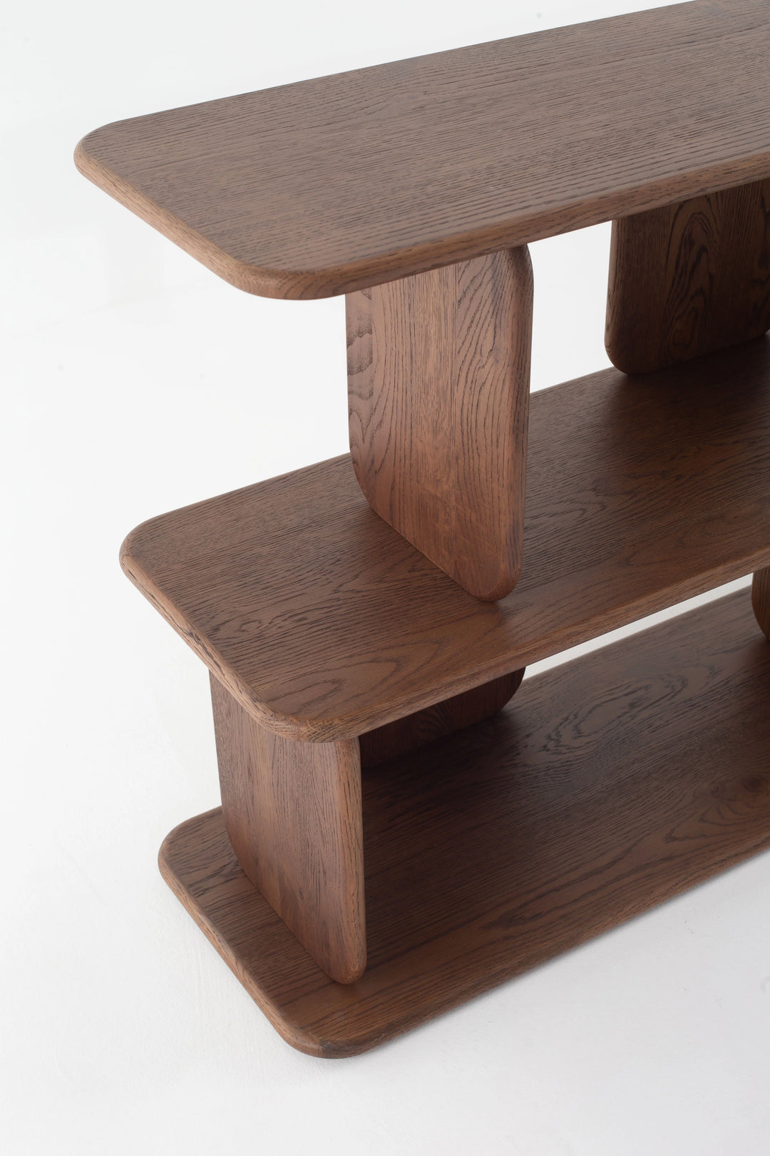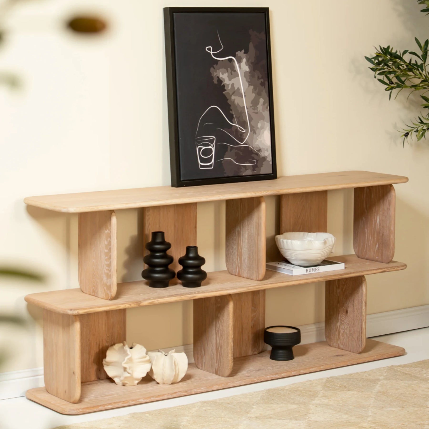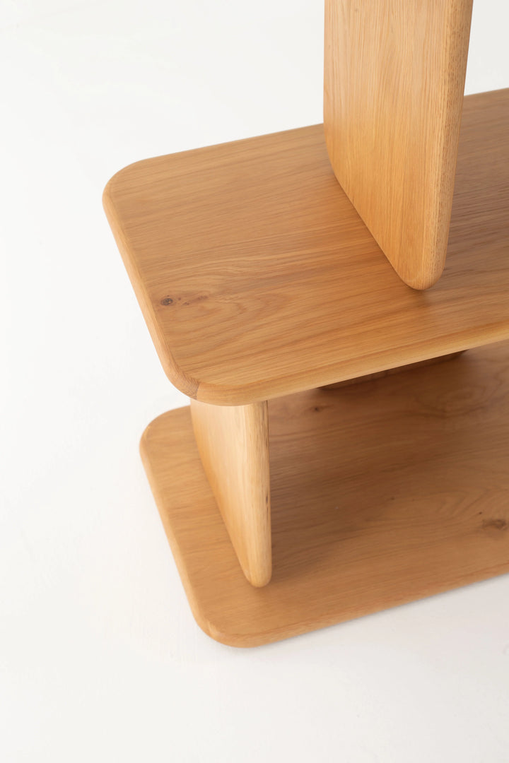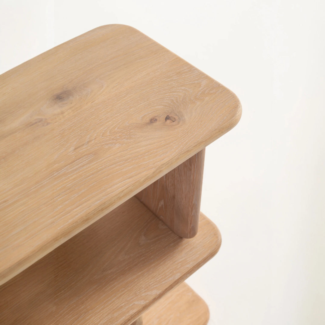 | Description | Crafted from Oak, this display shelf combines sculptural elegance with practical functionality. The sleek, rectangular panels and rounded edges create a fluid, contemporary design, while the rich wood grain texture enhances its organic appeal. With its open three-tier structure, this versatile piece offers ample storage and display space for books, décor, and essentials. Available in white oak, teak wood, mango wood, sheesham wood honey finished, and sheesham wood walnut finished, it seamlessly integrates into modern, minimalist, or Scandinavian interiors, making it a statement piece for living rooms, hallways, or offices. |