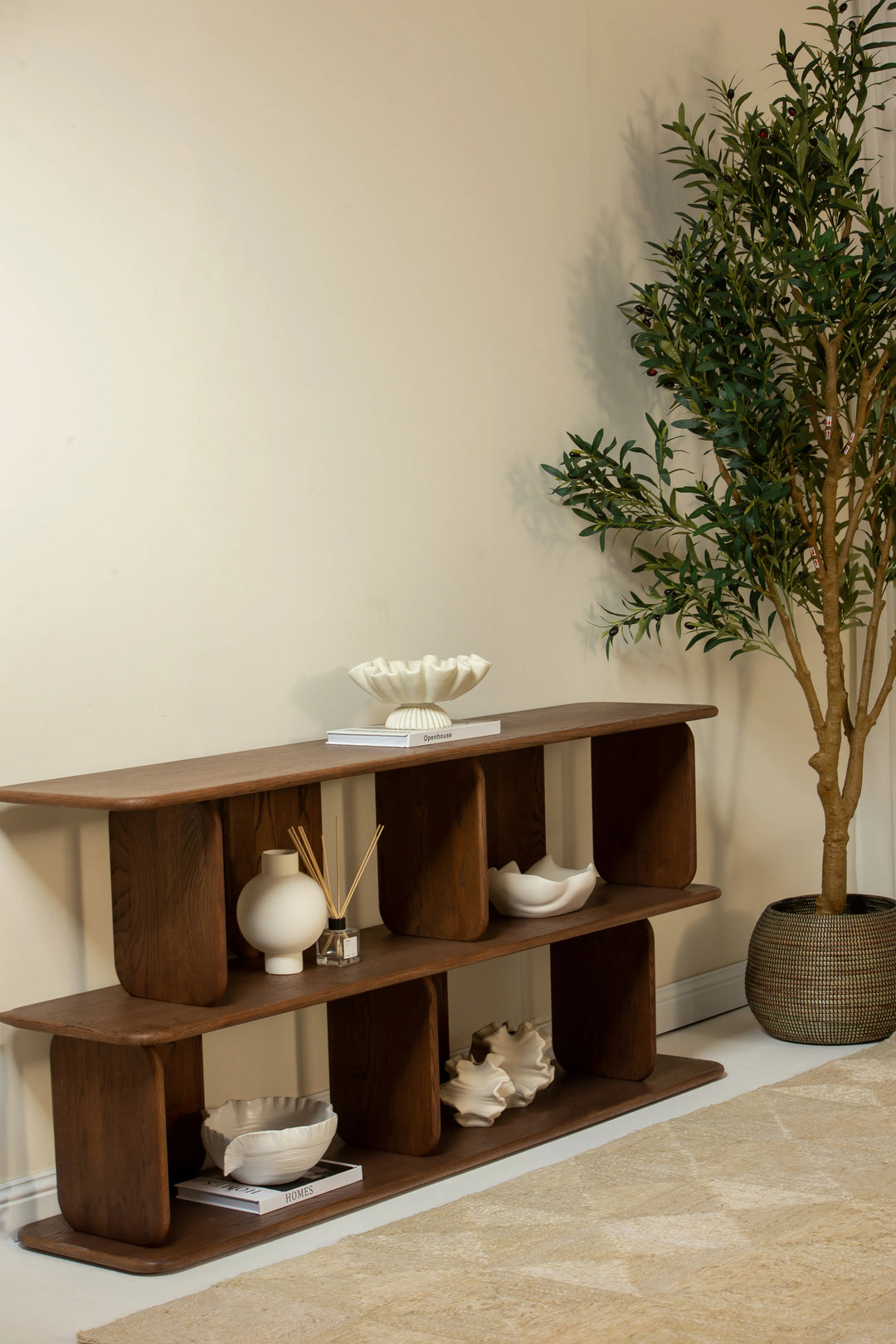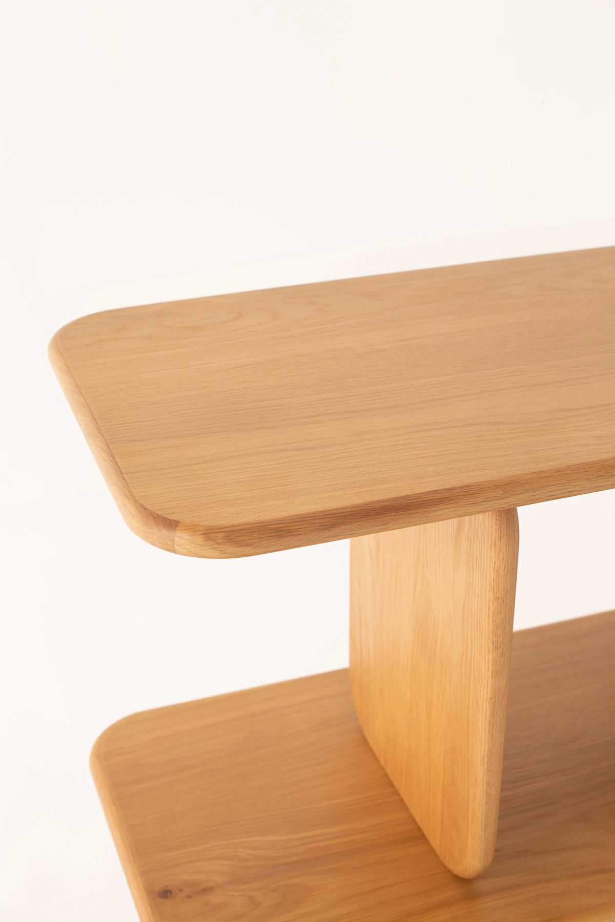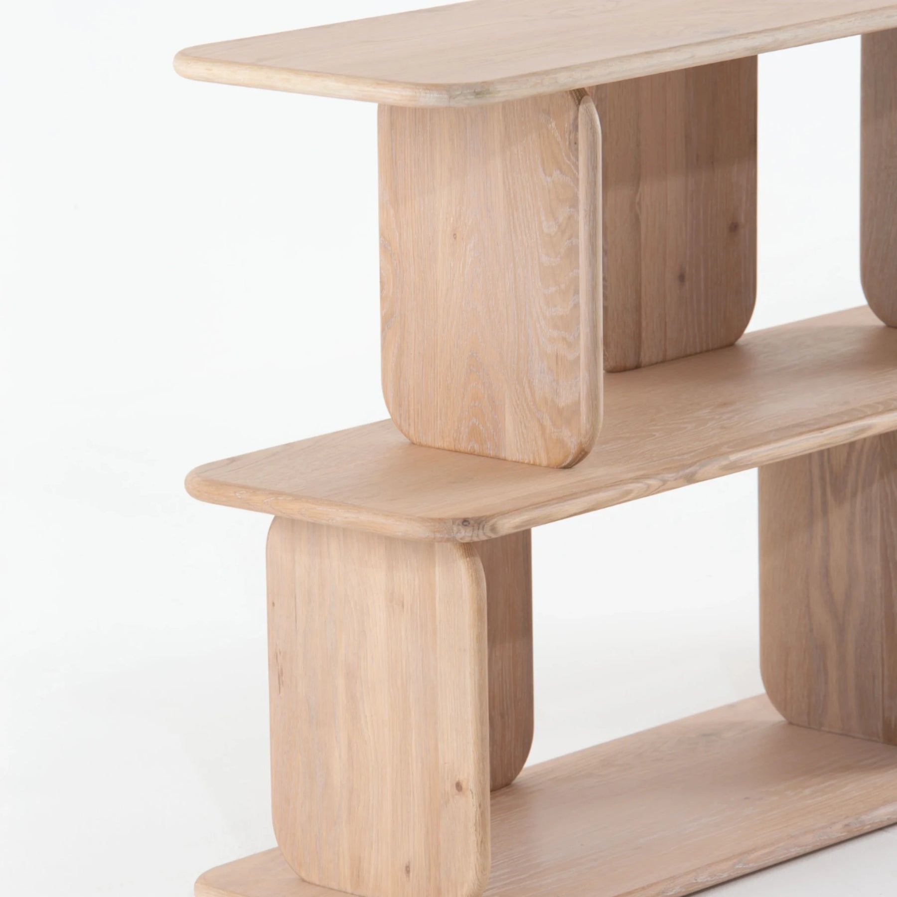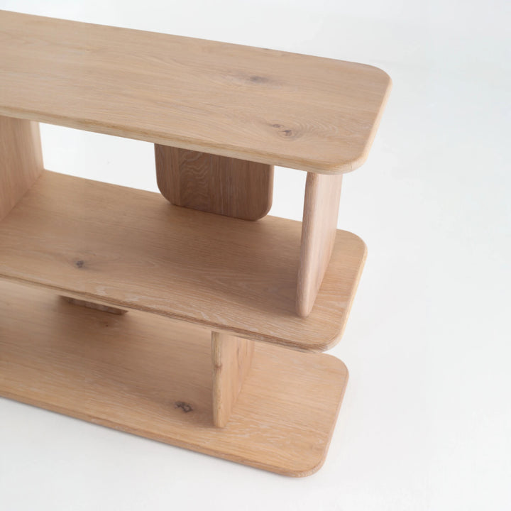 | Description | Crafted from Oak, this display shelf combines sculptural elegance with practical functionality. The sleek, rectangular panels and rounded edges create a fluid, contemporary design, while the rich wood grain texture enhances its organic appeal. With its open three-tier structure, this versatile piece offers ample storage and display space for books, décor, and essentials. Available in white oak, teak wood, mango wood, sheesham wood honey finished, and sheesham wood walnut finished, it seamlessly integrates into modern, minimalist, or Scandinavian interiors, making it a statement piece for living rooms, hallways, or offices. |