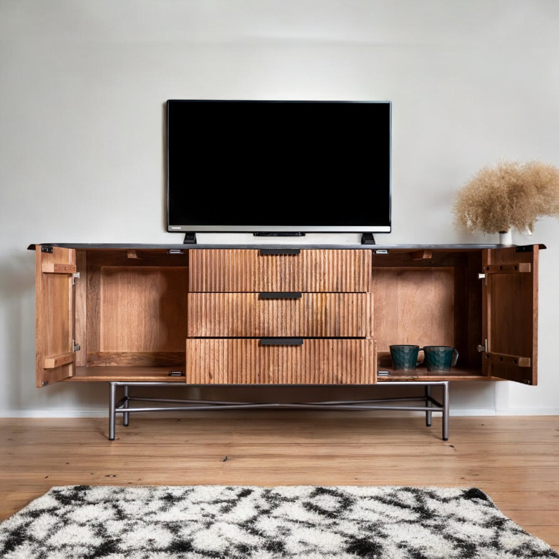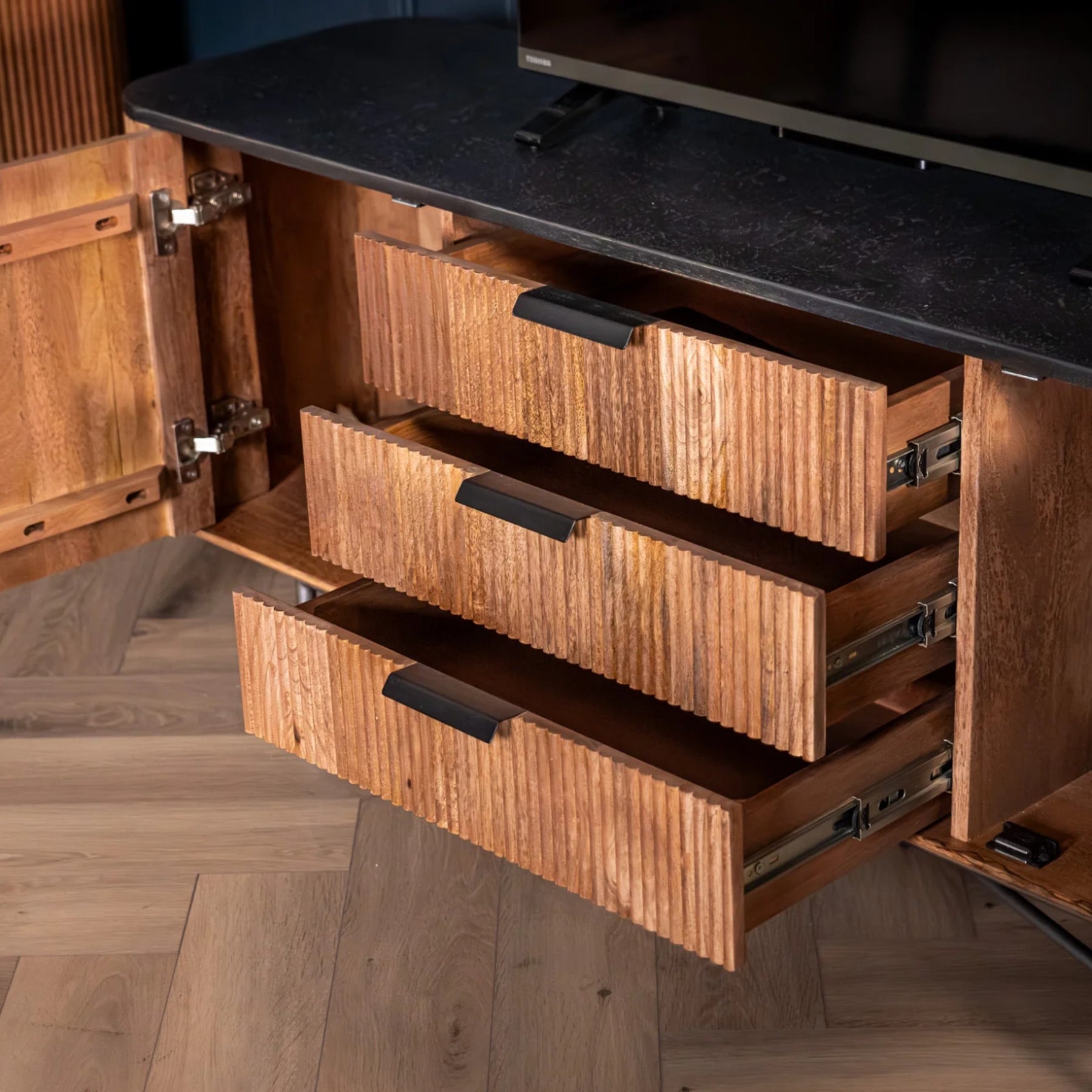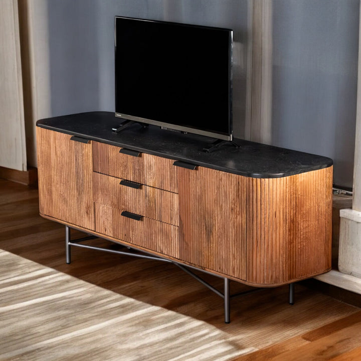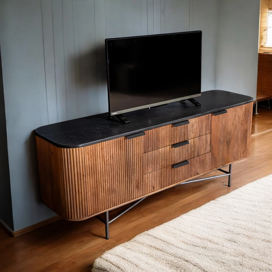 | Description | Elevate your living space with the Portofino Mango Wood TV Unit, a stunning blend of functionality and style. Crafted from high-quality mango wood, this entertainment center features a striking black mosaic top that adds a touch of elegance to any room. The fluted body design not only enhances its aesthetic appeal but also provides a sturdy foundation for your flat-screen TV, making it a perfect centerpiece for your entertainment area. |