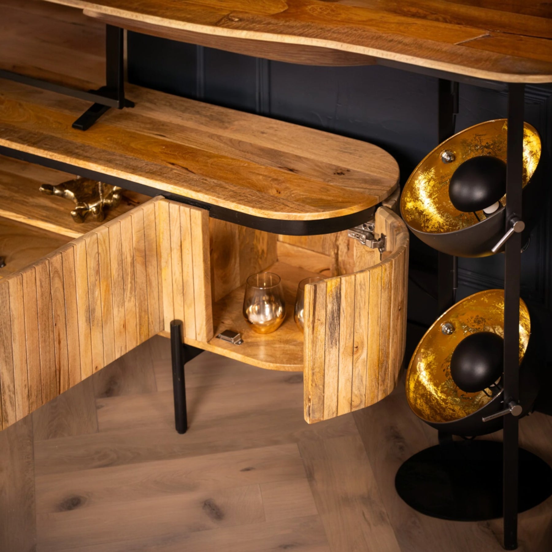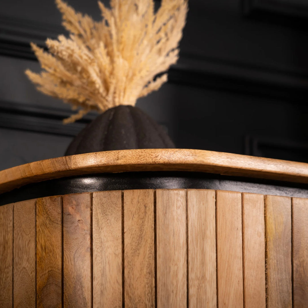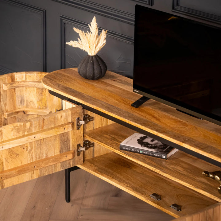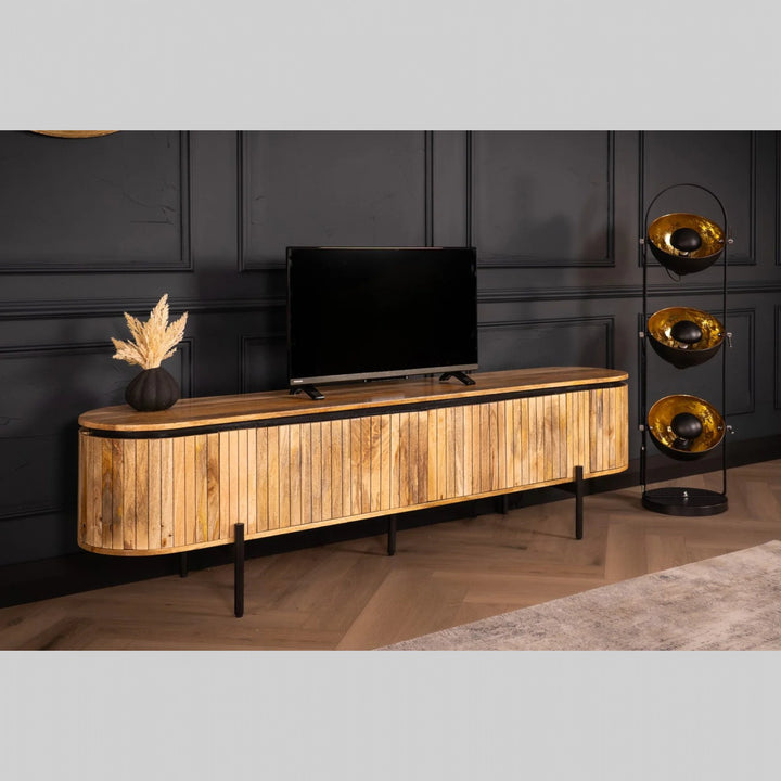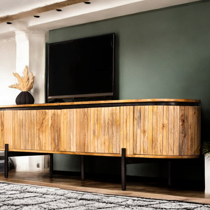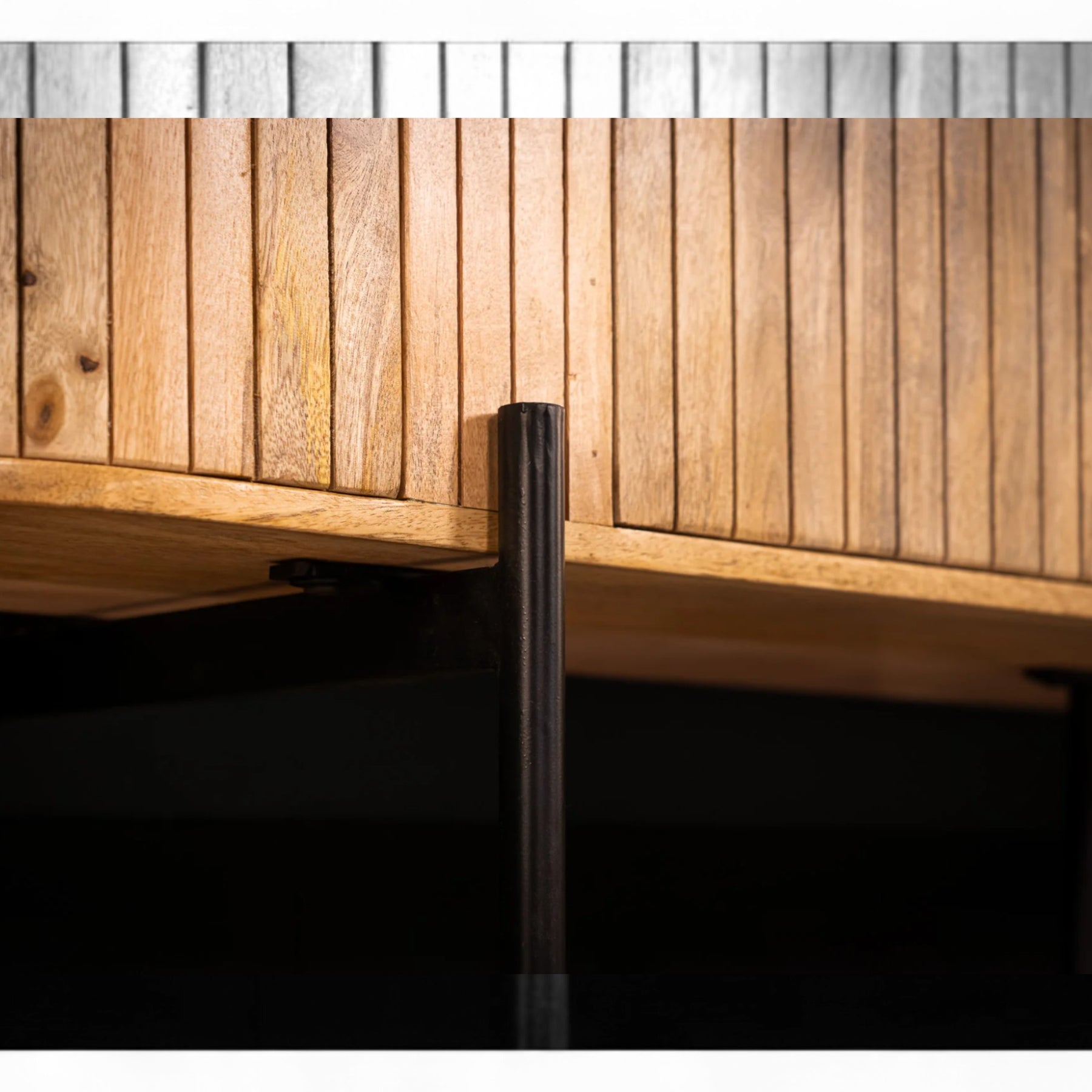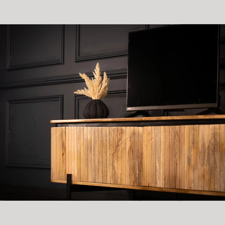 | Description | Discover the perfect combination of functionality and impressive flute design with our Reno collection. This piece not only offers enough space for your TV, but also makes a stylish statement in your living room. Natural beauty made of wood: The TV unit is made of solid mango wood, which has a warm and inviting character thanks to its natural grain finish. The timeless design becomes an eye-catcher in your living space thanks to the flute pattern and the black trims. |