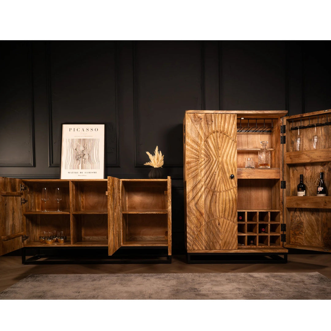 | Description | Do you love the extraordinary, and do you still lack a little storage space in your ambience? Then our extravagant sideboard is just right for your home. A solid body made of mango wood in an exciting black rests on a simple metal frame in gold. The highlight of the board, however, is without question the elaborate 3D carving that is attached to the front. The organic shapes seem to flow over the surface and inspire with their extraordinary look and feel. |