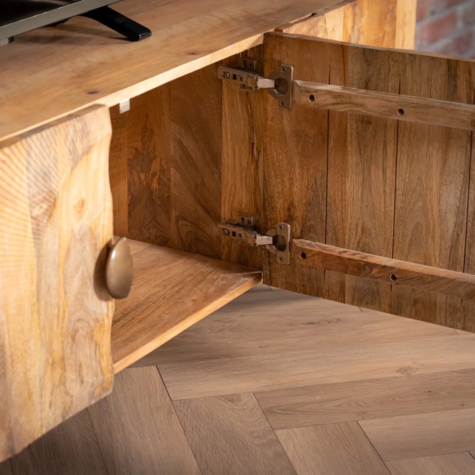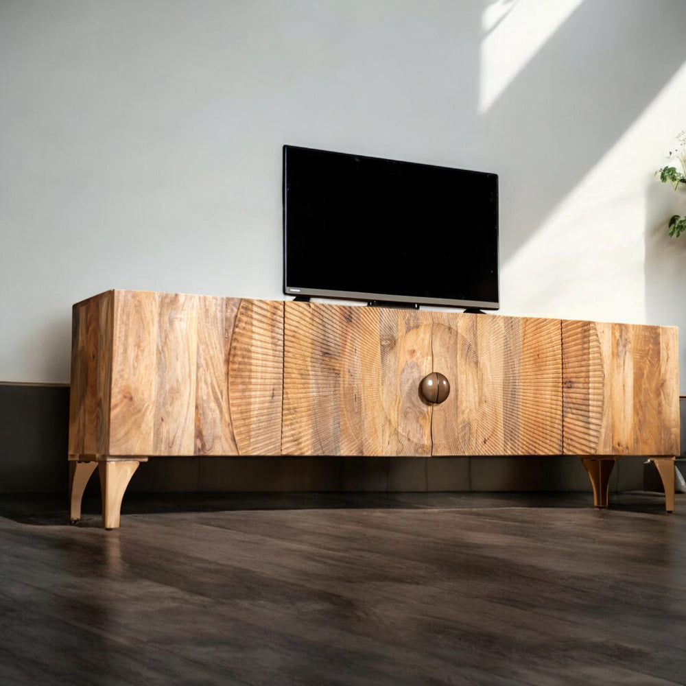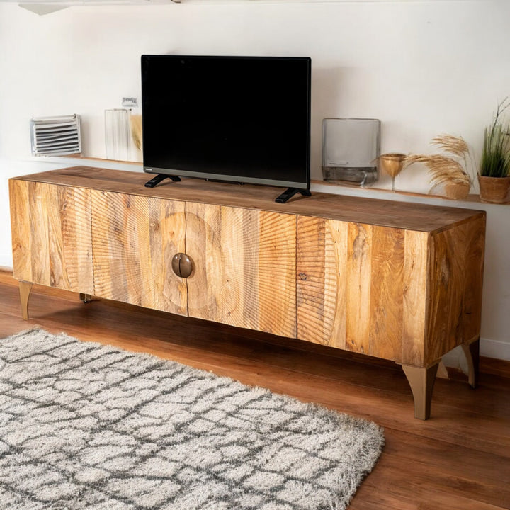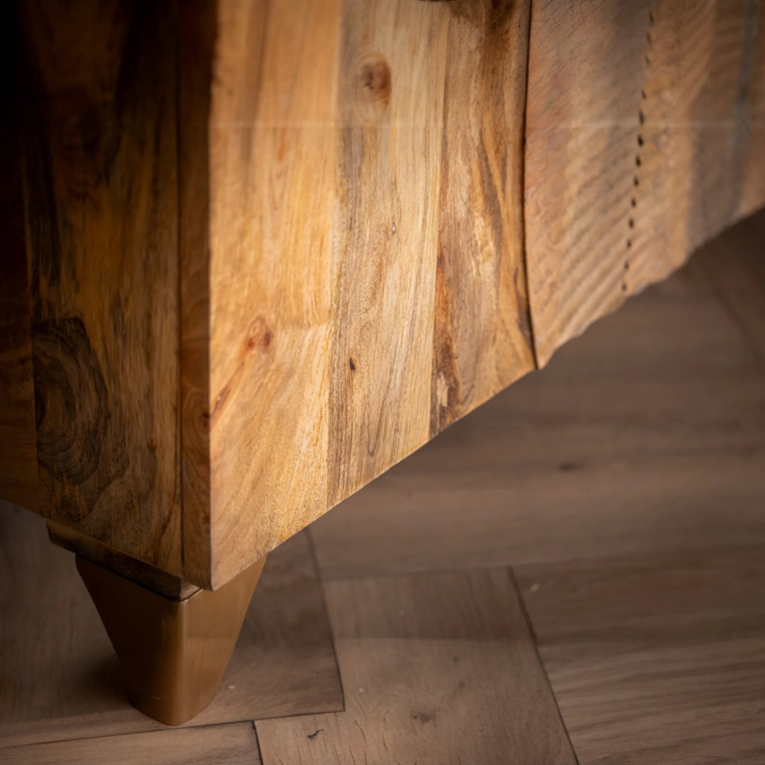 Experience pure elegance and craftsmanship with our handcrafted TV board, SUNSET. This exclusive design low board made of solid mango wood with gold accents and delicate metal legs sets new standards in living space design. The modern TV board impresses not only with its impressive size but also with the elaborate craftsmanship that goes into every detail. The deep natural mango wood color harmonizes perfectly with the gold accents, giving the board a touch of luxury. The delicate metal legs not only ensure stability but also create a modern contrast to the solid wood. Experience it yourself! |