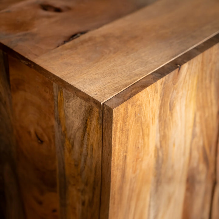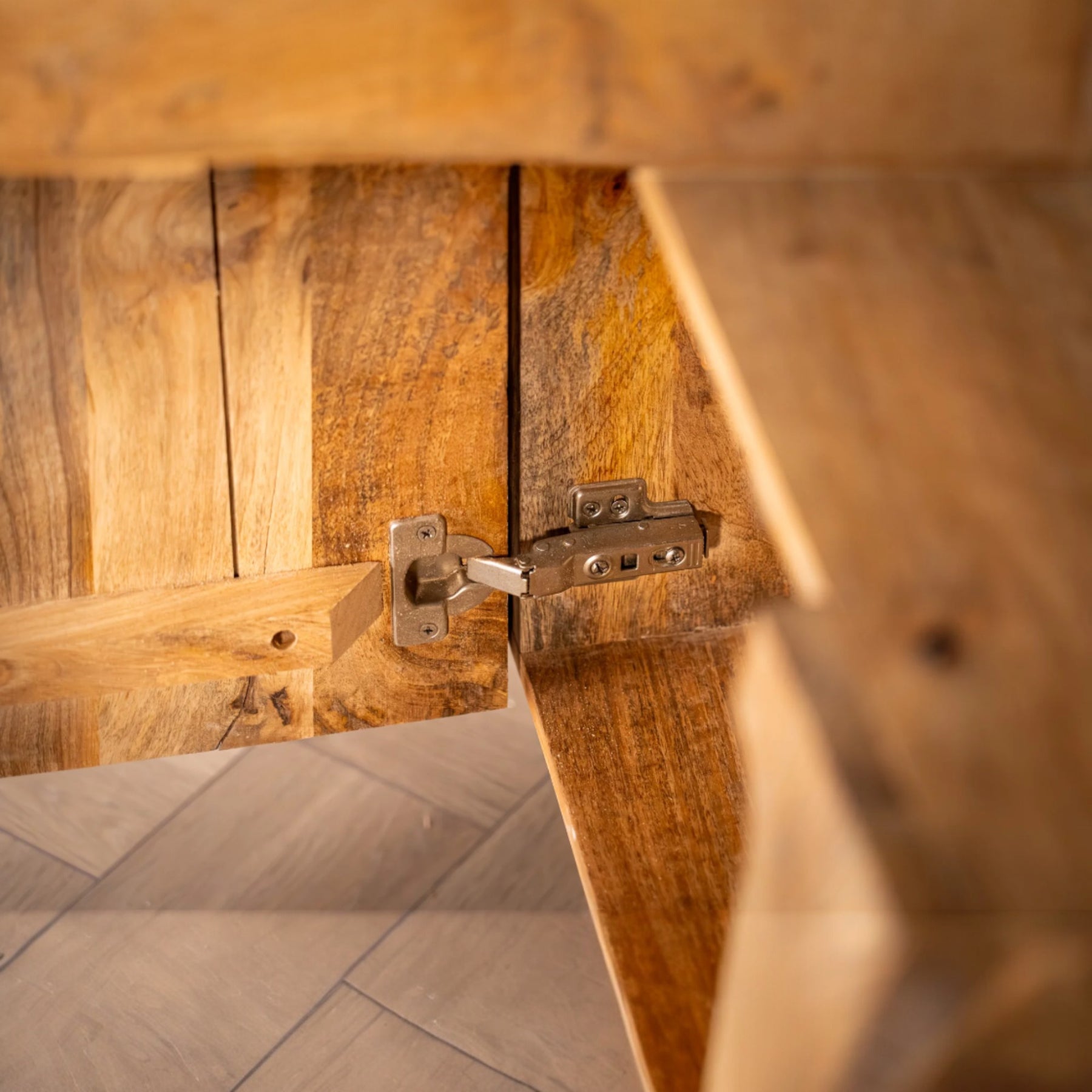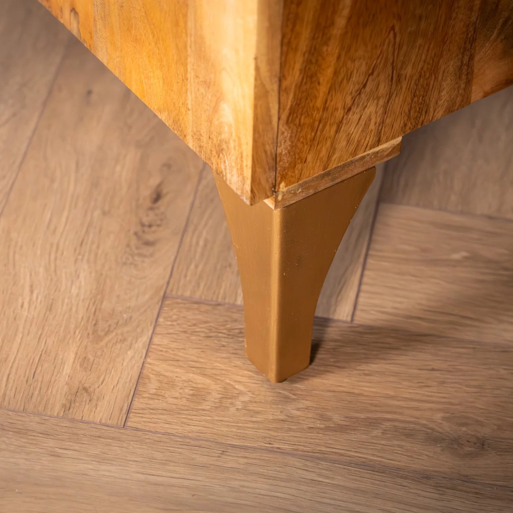 Experience pure elegance and craftsmanship with our handcrafted TV board, SUNSET. This exclusive design low board made of solid mango wood with gold accents and delicate metal legs sets new standards in living space design. The modern TV board impresses not only with its impressive size but also with the elaborate craftsmanship that goes into every detail. The deep natural mango wood color harmonizes perfectly with the gold accents, giving the board a touch of luxury. The delicate metal legs not only ensure stability but also create a modern contrast to the solid wood. Experience it yourself! |